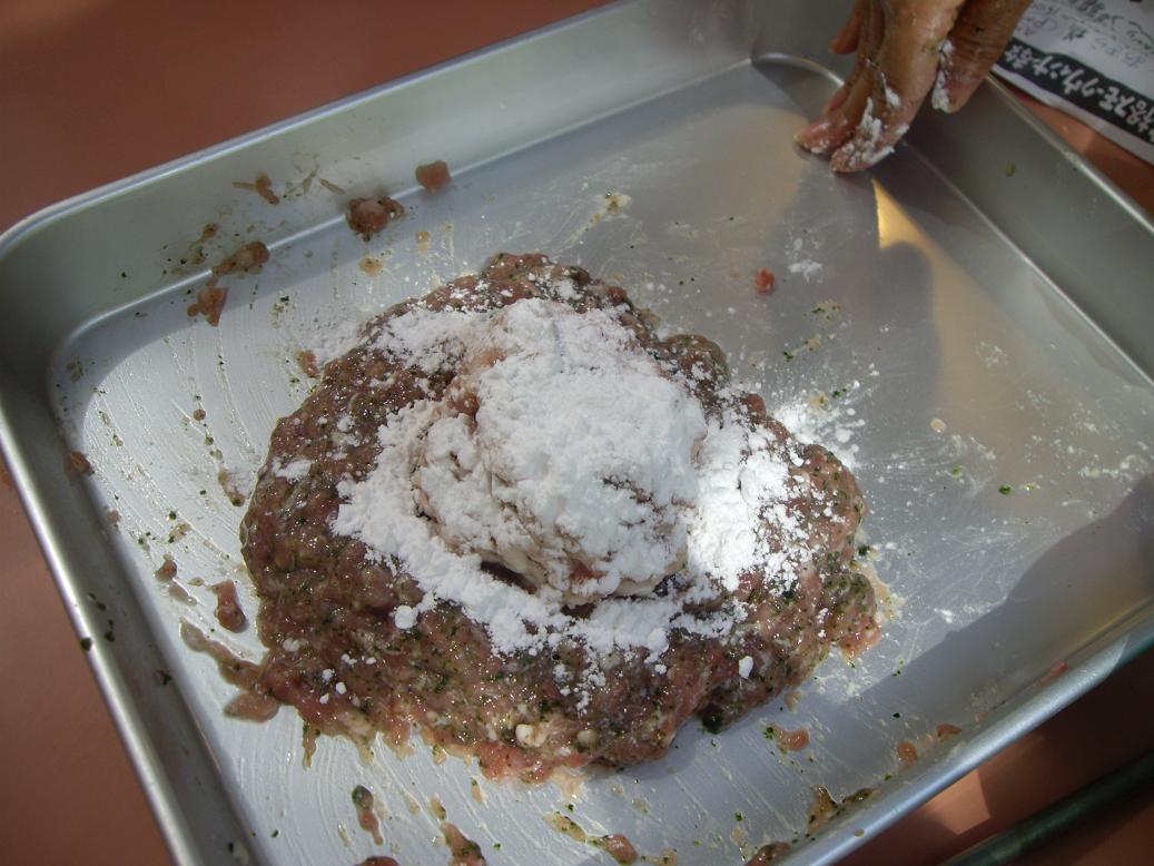 その後、つなぎや香辛料を入れ、脂身を投入、脂身のツブツブをバラすように混ぜます。
