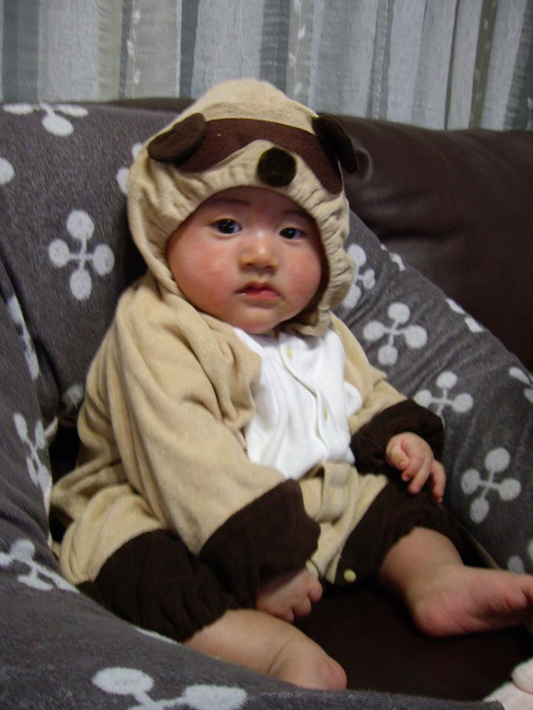 旦那が買ってきた狸スーツを着て、超ご機嫌のぶんちゃん。