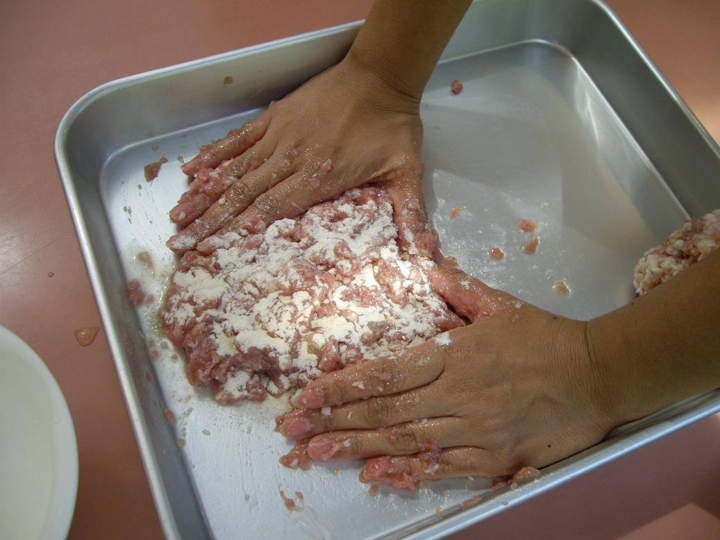 その後、つなぎや香辛料を入れ、脂身を投入、脂身のツブツブをバラすように混ぜます。